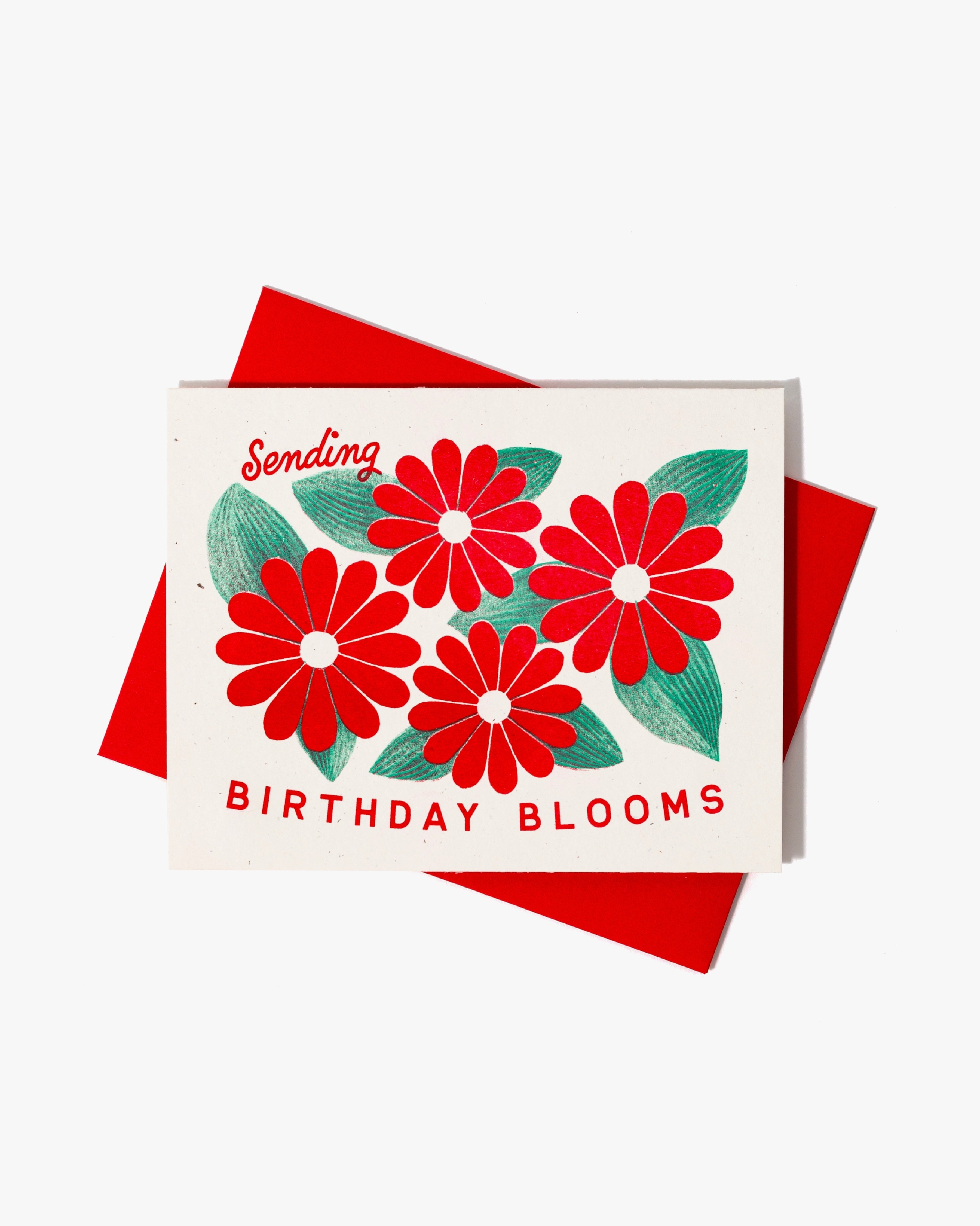 Send a paper bouquet of birthday blooms! Risograph printed in bright red and seafoam ink using eco-friendly, vegetable-based inks. Printed on 100% recycled, FSC-certified fiber-fleck cardstock. Designed and printed by Bromstad Printing Co.