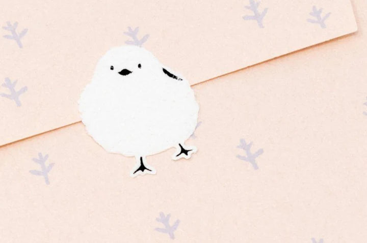 This adorable stationery set includes twelve sheets of lined Midori paper, four patterned envelopes, and four fuzzy Chibby bird stickers for sealing. The envelopes are perfectly sized to fit the paper without folding.