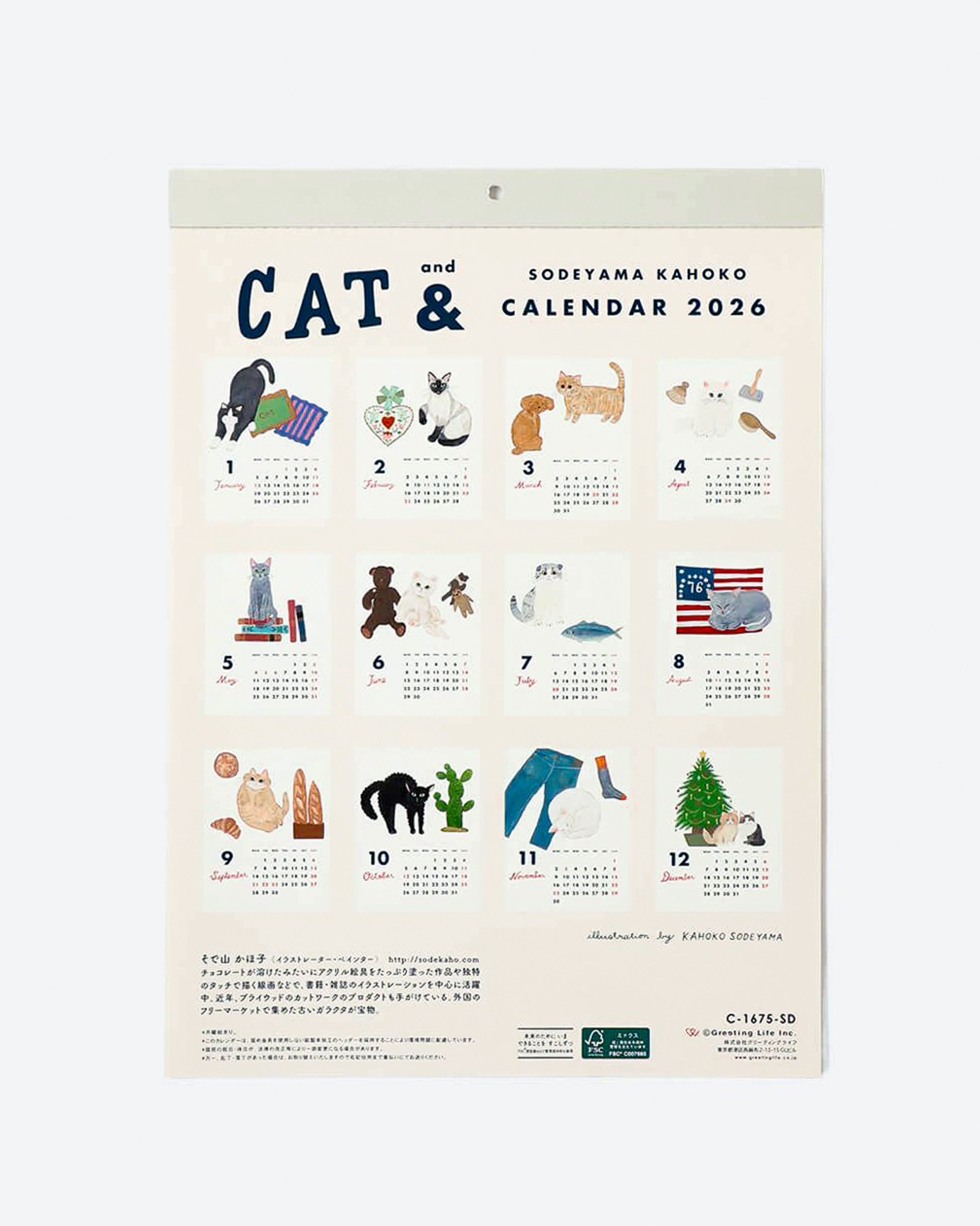 This "Cat &" wall calendar is by Japanese artist Kahoko Sodeyama. She is known for her unique illustration style using acrylic paint. She loves cats and couldn't help but paint them for this year's calendar! It includes a small hole for hanging, and each month tears off easily along the perforations.