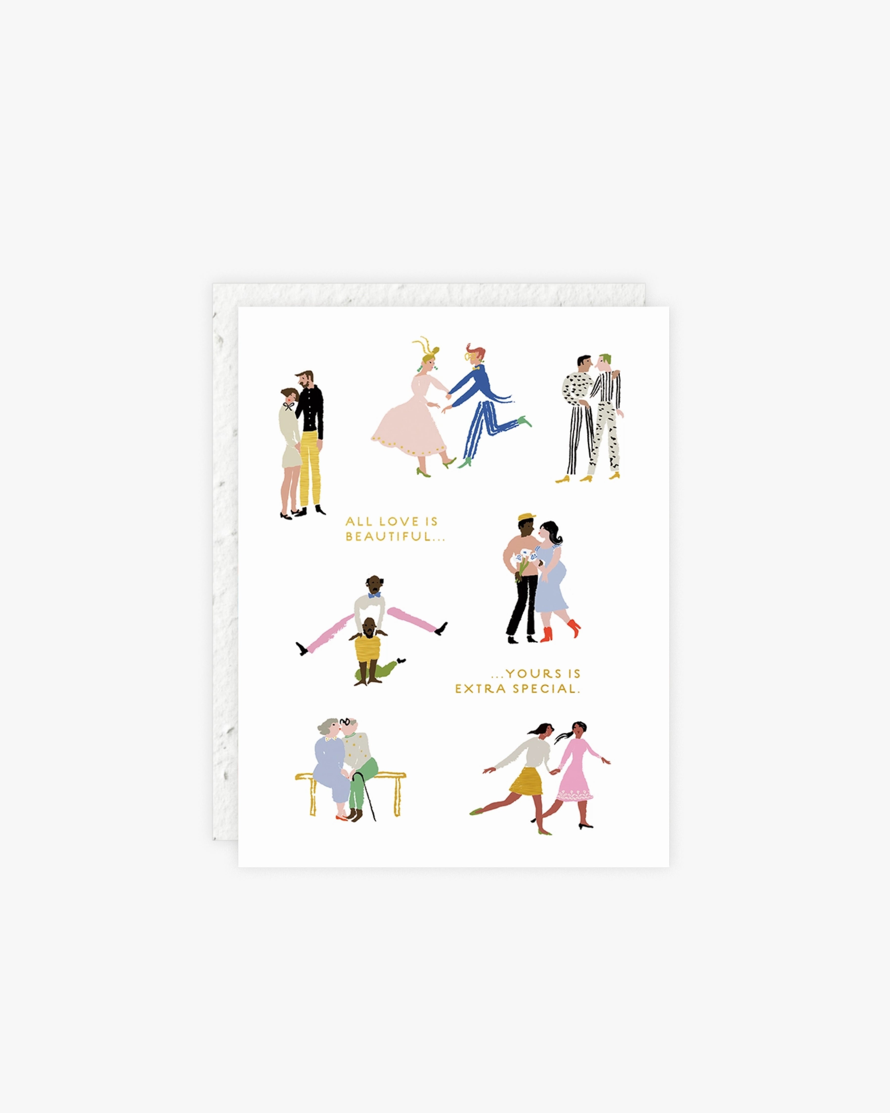 A cute wedding card with foil details, paired with a plantable seed paper envelope. Seedlings envelopes are embedded with non-invasive wildflower seeds and naturally compost when planted—leaving only flowers behind.