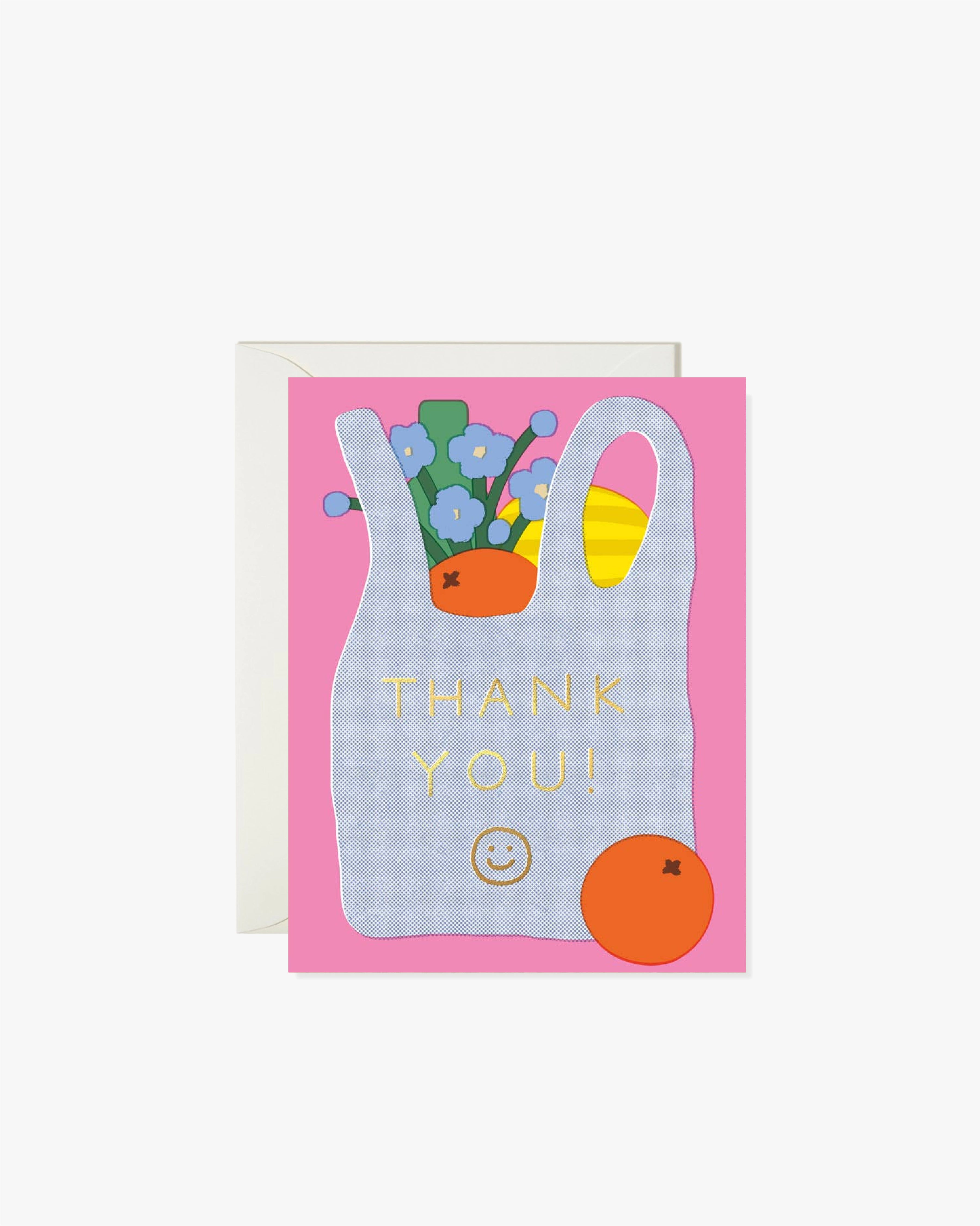 A thank you grocery bag card with hand-drawn illustrations and typography by artist Elena Boils. Gold foil finish. Printed in the UK.